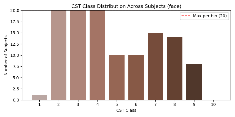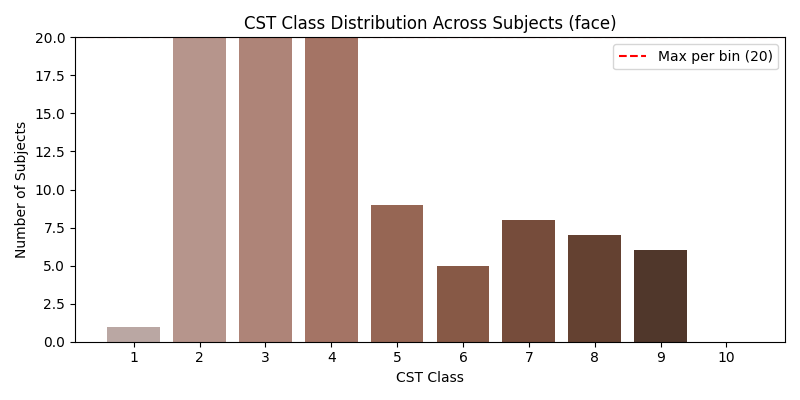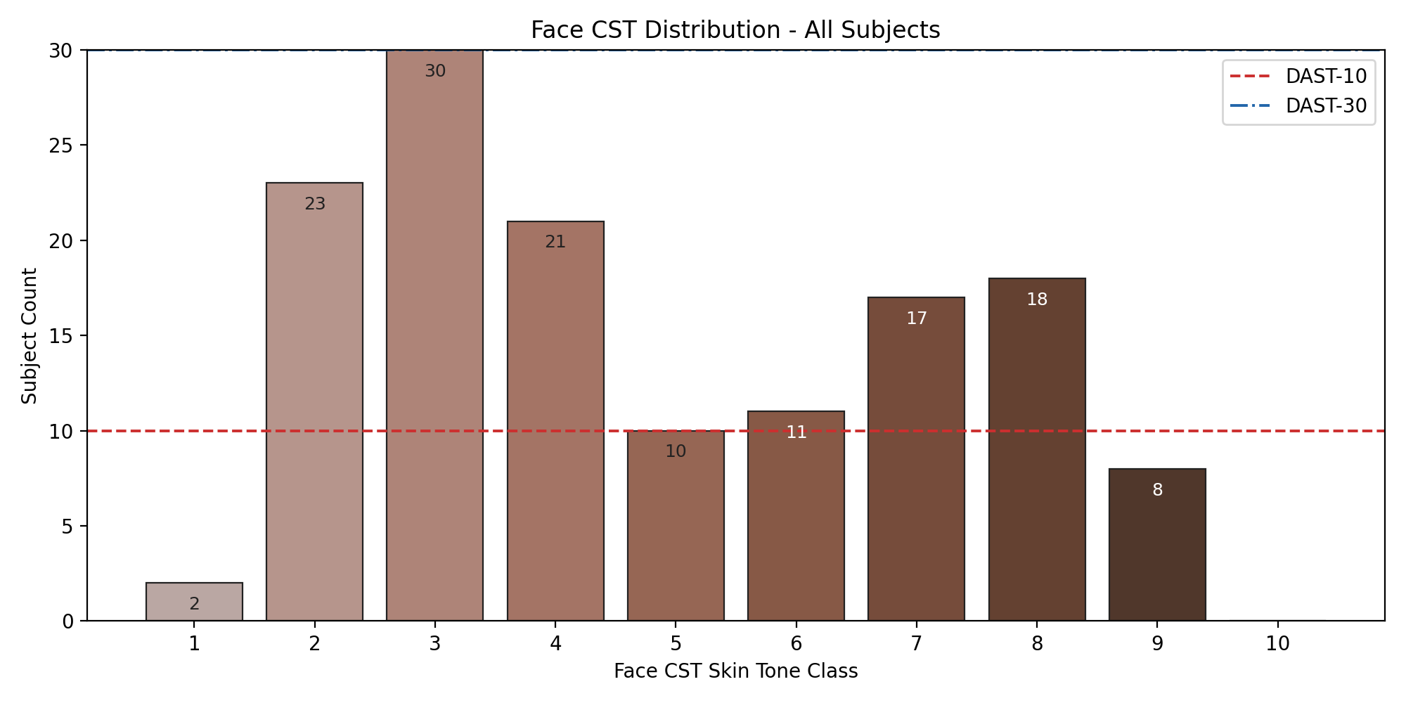 Für unsere Studie ist ein möglichst breites Spektrum an Hauttönen erforderlich, um die Leistungsfähigkeit biometrischer Systeme unter realitätsnahen Bedingungen bewerten zu können. Grundlage ist eine Einteilung in zehn Hauttyp-Klassen (1–10), für die jeweils ca. 20 Teilnehmende vorgesehen sind.